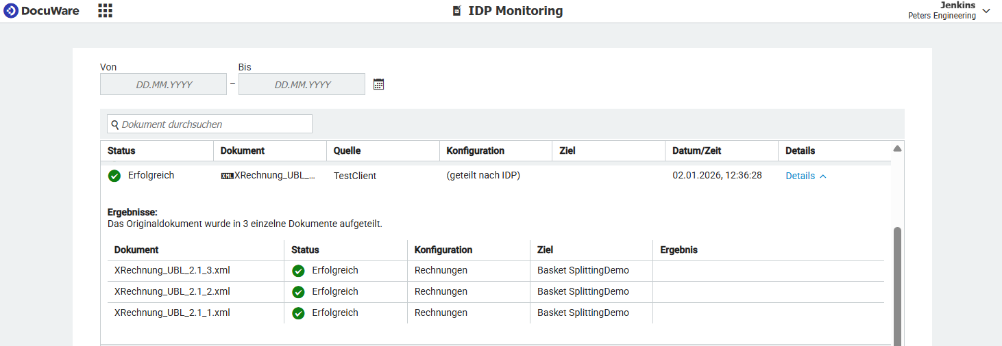Sie können die IDP-Jobs mit aktivierter Trennfunktion detailliert im Bereich DocuWare Konfigurationen > Erfassen > IDP-Monitoring verfolgen. Als erster Eintrag erscheint die Ausgangsdatei, die Details zu den generierten Einzeldokumenten lassen sich ausklappen: