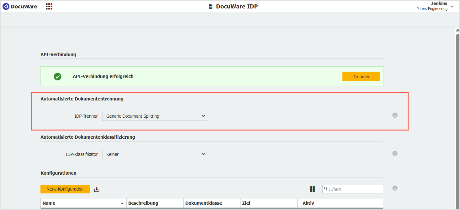 Beim Anlegen eines Import- oder Scan-Auftrags in DocuWare Desktops Apps wählen Sie die IDP-Konfiguration aus, in der Sie die Trennung aktiviert haben.