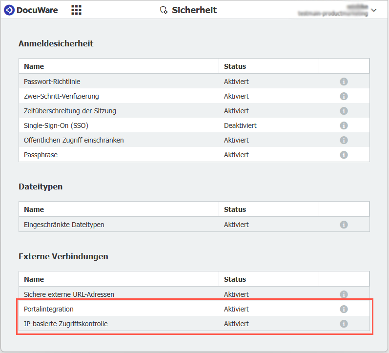 Anstelle einer separaten Konfigurationskomponente sind die zentralen Gateway-Einstellungen nun Teil der Komponente Sicherheit. Daher enthält der Abschnitt Externe Verbindungen die Einträge Portalintegrationen und IP-basierte Zugriffskontrolle, in denen Sie die zulässigen Domänen oder IP-Adressen auflisten.
