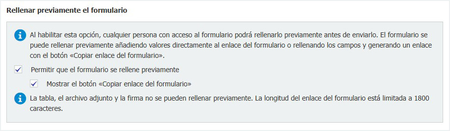 Nueva sección dentro de la configuración de Formularios para permitir que los formularios se rellenen previamente.