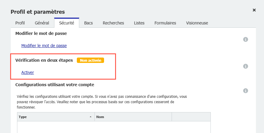 Étape 2 : Les utilisateurs individuels activent l'authentification en deux étapes pour leur propre compte dans l'onglet Sécurité dans Profil et paramètres :