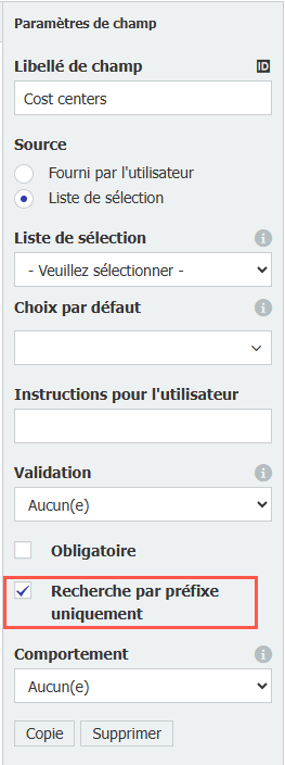 Activez l'option Recherche par préfixe uniquement dans les paramètres des champs déroulants basés sur une liste de sélection.