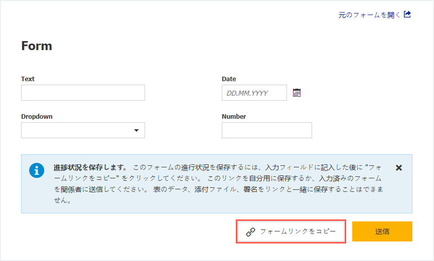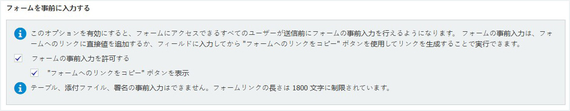 エンドユーザーがフォームの事前入力を行えるようにするには、追加で 2 つ目のオプション ’"フォームリンクのコピー" ボタンを表示する’ を選択してください。 1 回のセッションでフォームの入力を完了できないエンドユーザーについては、通常通りにフォームを記入してからフォームリンクをコピーして保存することで進捗を保存することができます。 これにより、入力されたデータが URL パラメーターとして含まれます。