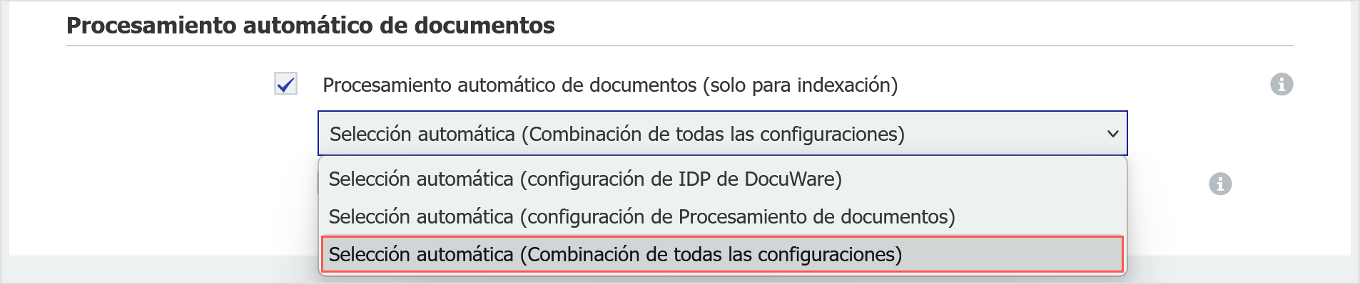En la configuración de DocuWare, vaya a Correo electrónico general > Configuración > Opciones de importación. Active «Procesamiento automático de documentos (solo para indexación)» y seleccione Selección automática (Combinación de todas las configuraciones).